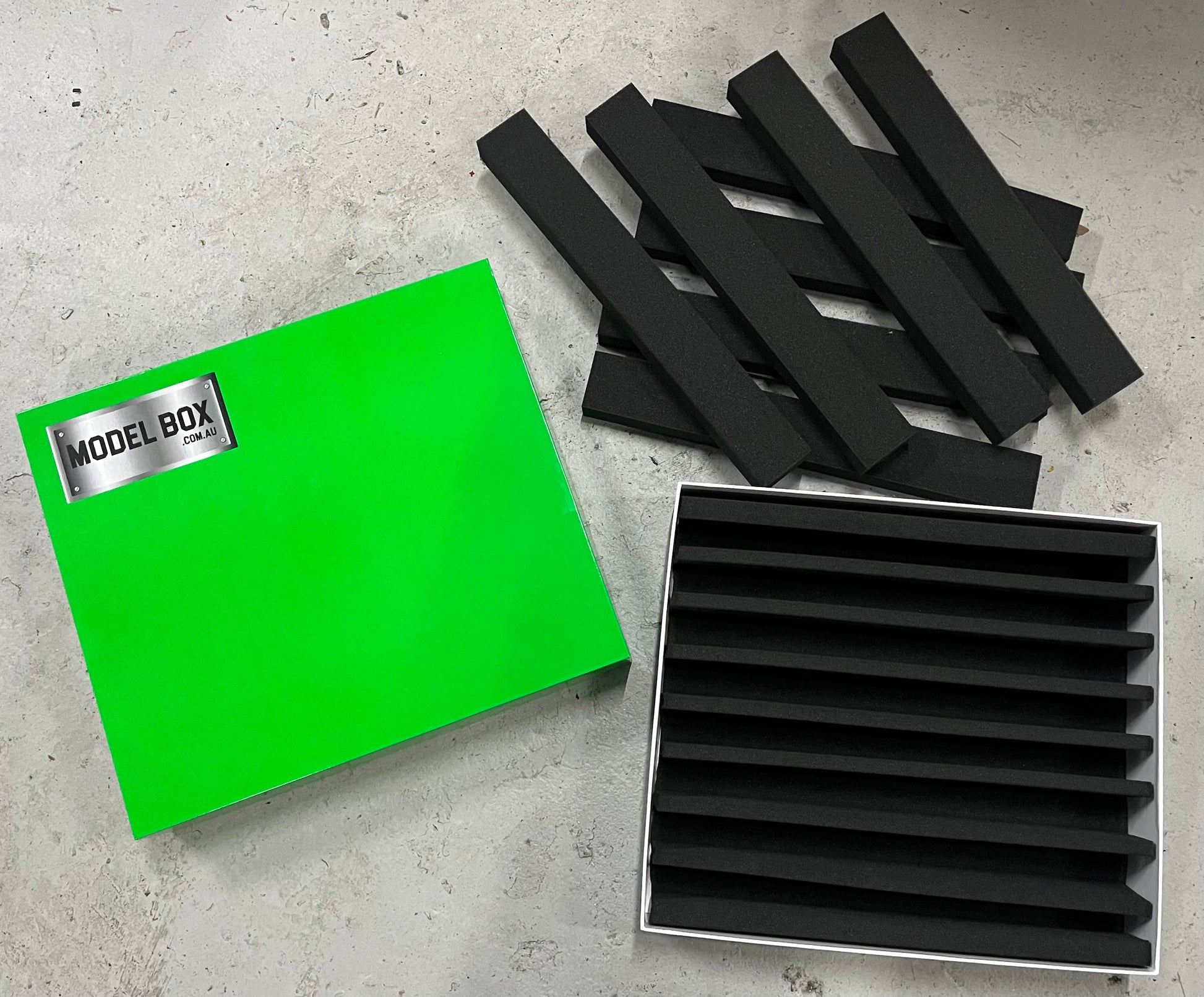 Midnight coloured specialty foam will look cleaner for longer - avoiding stains from oils and rail grime which discolours other light coloured products. Significant effort was expended in establishing the optimal density of the foam to provide both maximum cushioning for your models as well as maintaining its shape even when the box is not fully populated.